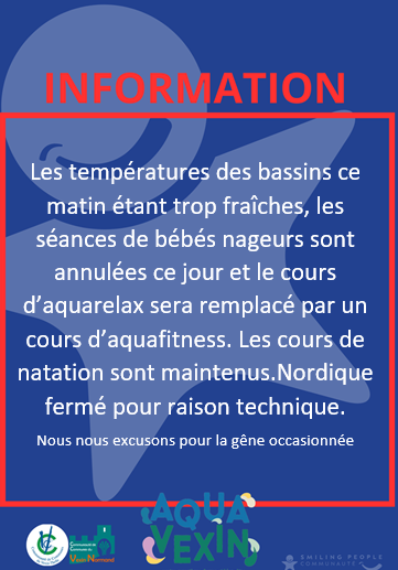 Fitness : 09:00 - 12:00 et 14:00 - 18:00 | Bassin sportif : 14:00 - 18:00 | Bassin ludique : 14:00 - 18:00 | Bassin nordique : 09:00 - 12:00 | Accueil : 09:00 - 12:00 et 14:00 - 18:00